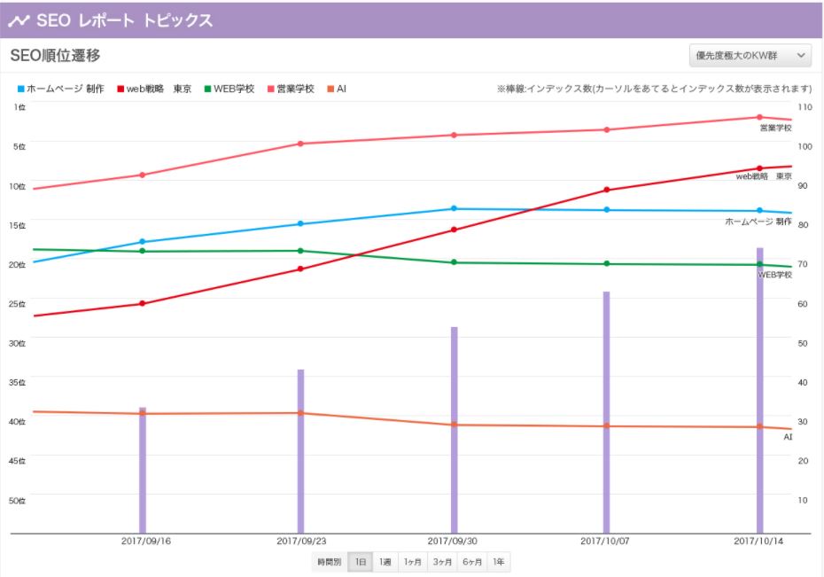 設定した検索キーワードは常にGoogleとYahooの検索順位を捕捉し、アーカイブされていきます。グラフで検索順位の遷移を判断する事が出来、今自分が行っているSEO対策が正しいのかどうかを照らし合わせていく事が重要です。