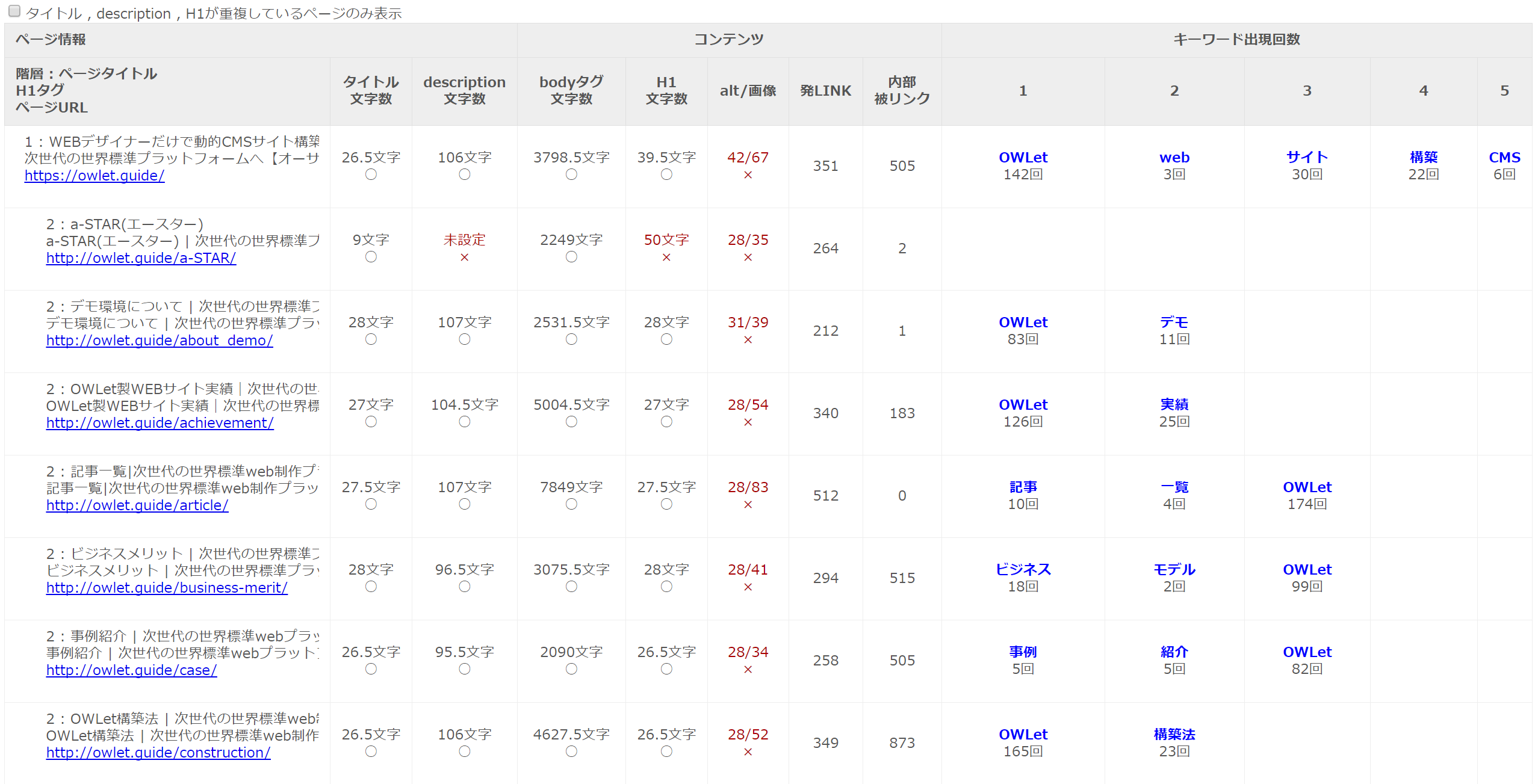 OWLet Analyzerがページ単位でSEO対策がキチンと出来ているか否かを判定し、表で表してくれます。