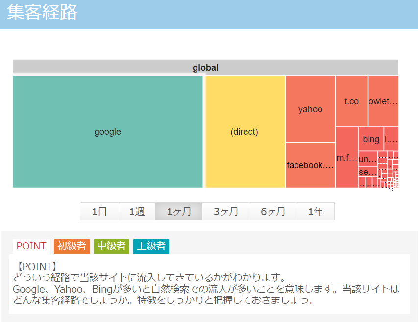 施策の種類をあげるときりないですが、大事なのは実行した集客施策がちゃんと効果が出ているのか把握しないと始まりません。OWLetAnalyzerでは期間を選択する事ができるので、自分のサイトがどの集客経路でユーザーを獲得しているか、変化しているかを1日、1週、1ヶ月、3か月、6ヶ月、1年と遷移を見る事が出来ます。