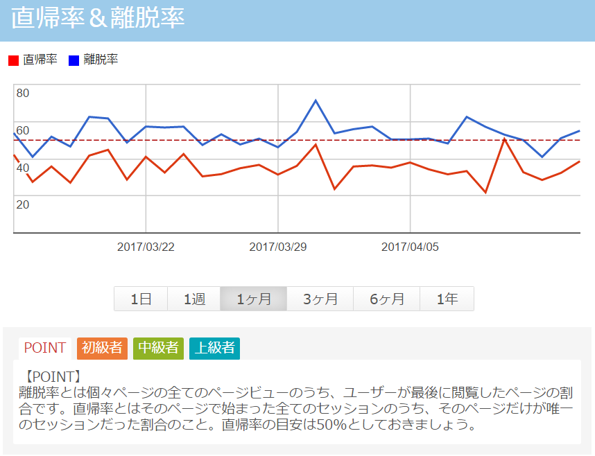 大体直帰率は最低50%を切るようにしましょうと言われています。OWLetAnalyzerで直帰率/離脱率を把握し、まずは直帰率を50%を切れるように、自分のホームページを改善していく必要があります。