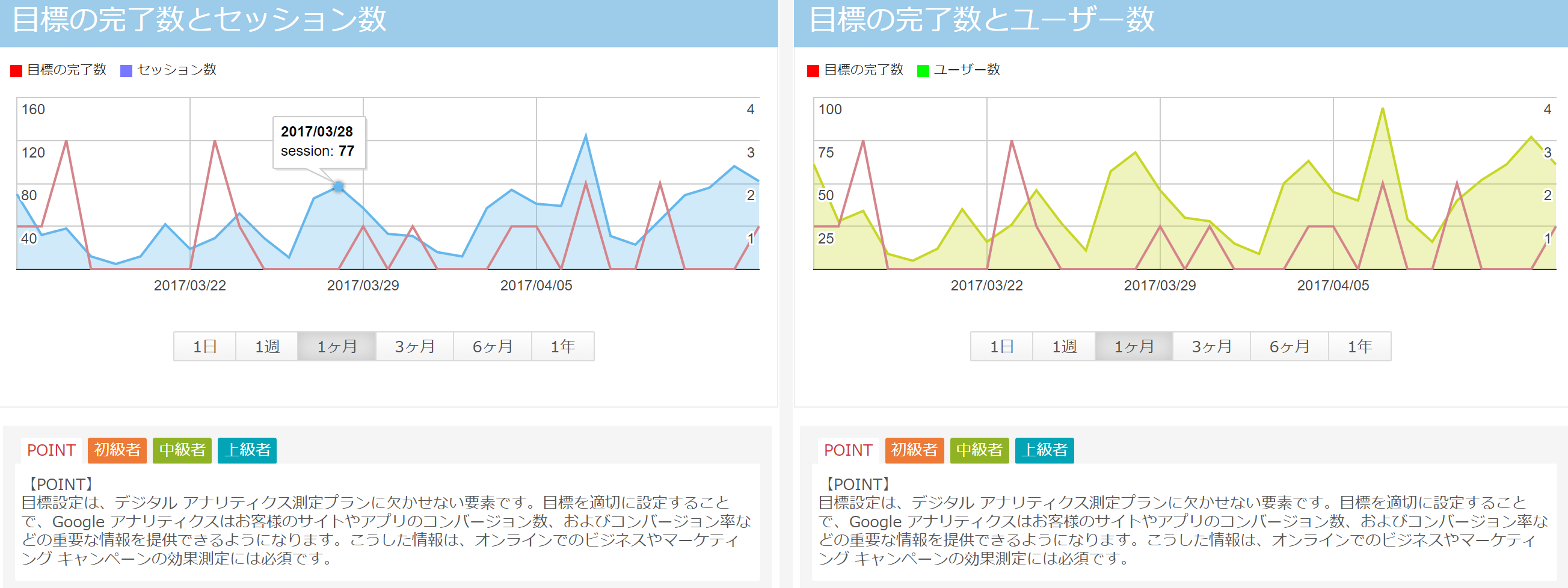 目標の完了数とセッション数/ユーザー数