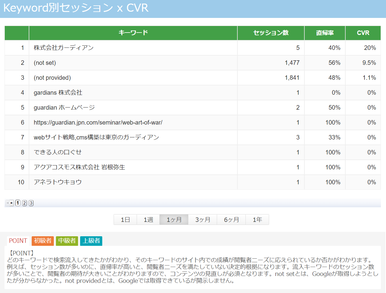 検索キーワード毎の集客数(=セッション数)とCVR(=問合せ率)の比較表になります。