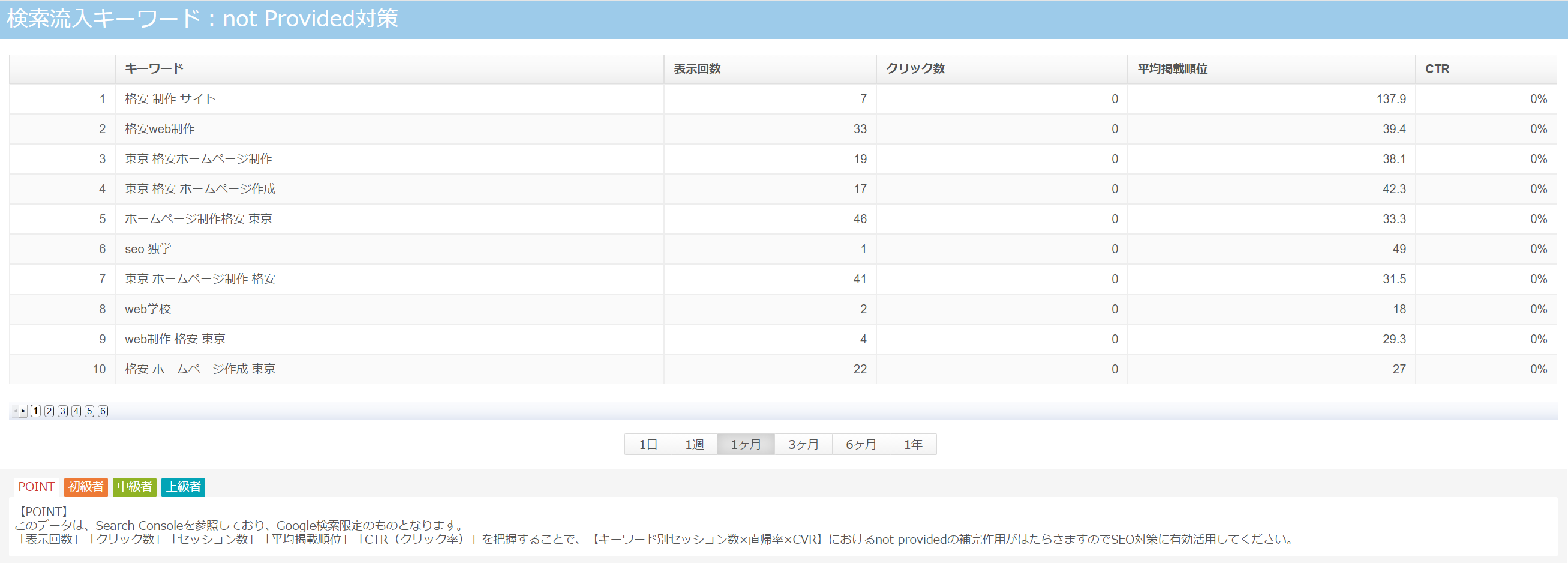 ホームページに訪れるユーザーの検索キーワードは、「not provided」と表記され、判定出来ない場合が多いです。Googleが「セキュリティ通信」をしているユーザーの情報は取得しない事にしていためです。それを補完するものとして、Googleのサーチコンソールの情報を引っ張ってきています。