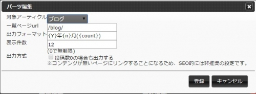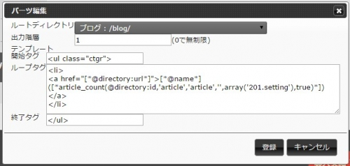 「ディレクトリ一覧パーツ」を設置したら図のようなダイアログが表示されます。