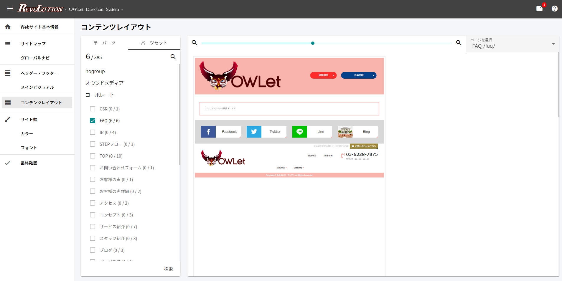 【REVOLUTION】には各項目に分けたパーツが用意されており、そこからご希望のパーツをドラック&ドロップで配置できます。